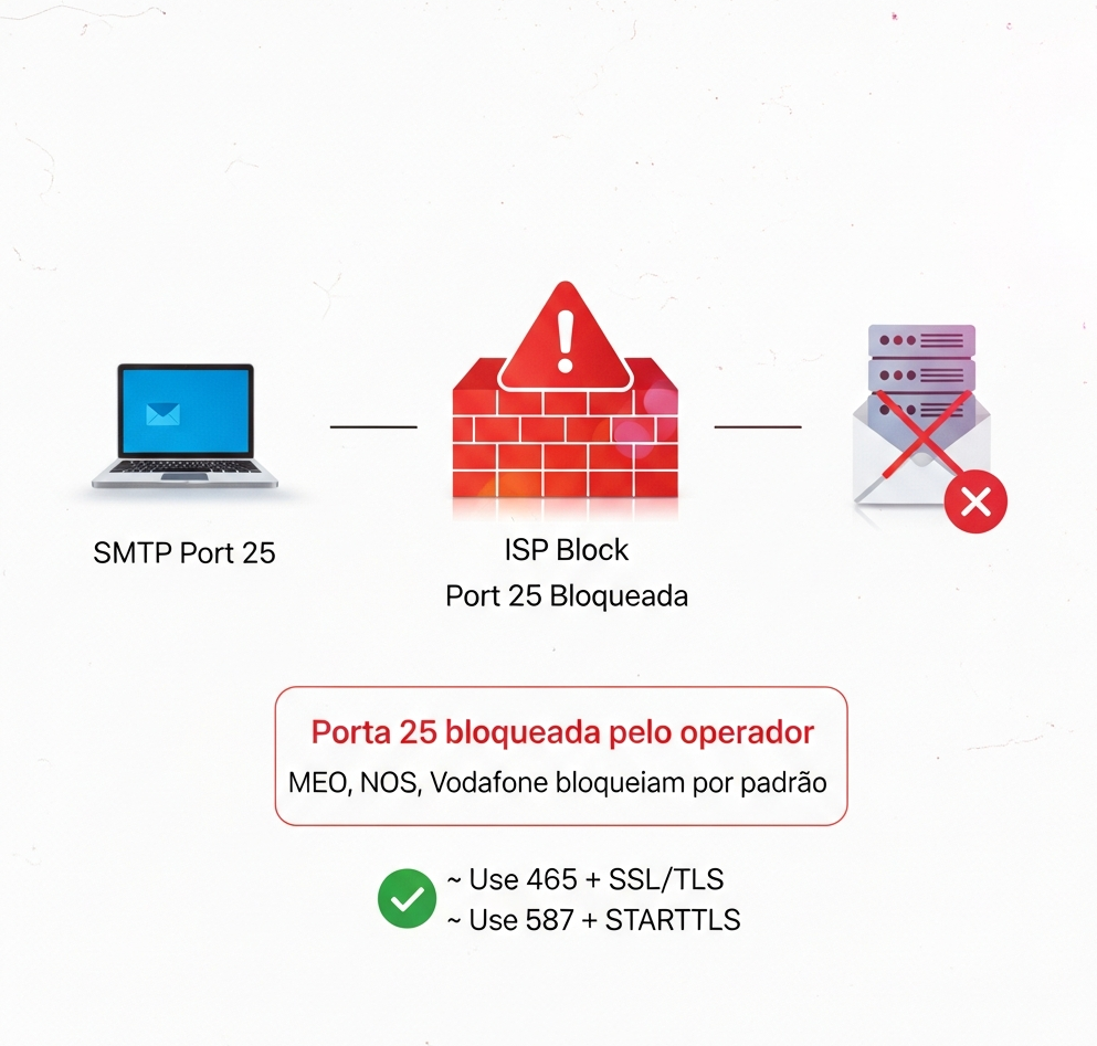 Em Portugal, operadores como MEO, NOS e Vodafone bloqueiam a porta 25 por padrão.