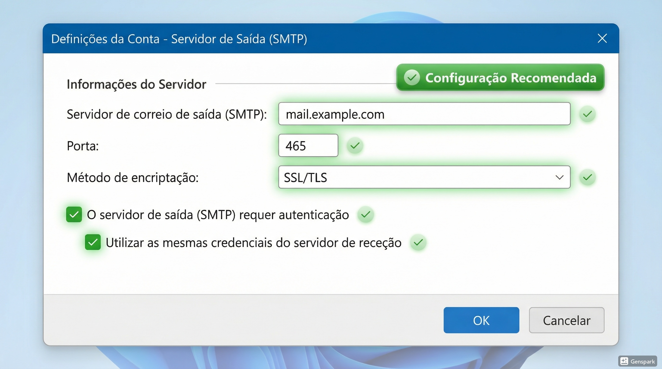 Se o Webmail funciona mas o Outlook não envia, o problema está quase sempre na configuração SMTP do cliente.