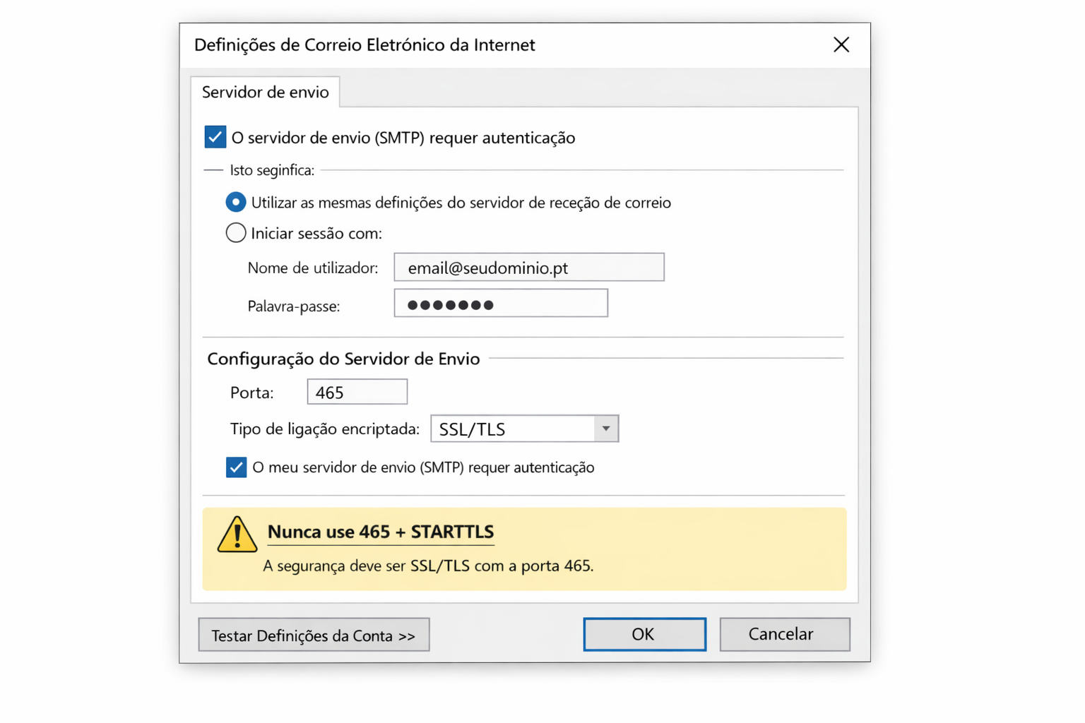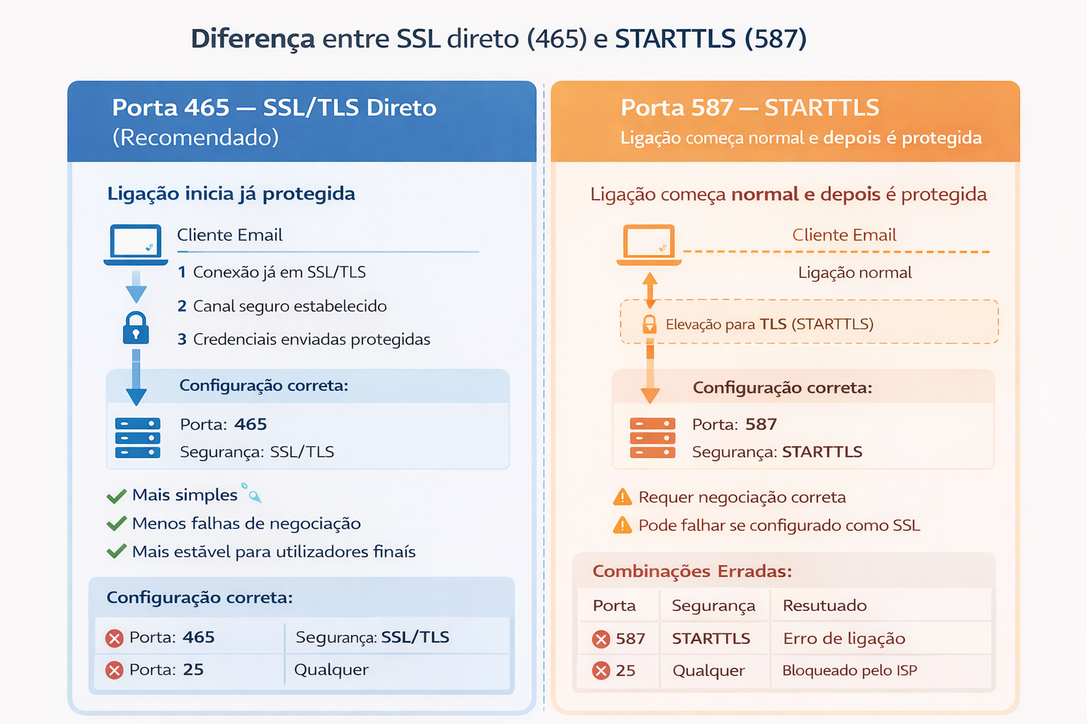 Explicar de forma prática qual a porta correta para envio SMTP (465 ou 587), evitando erros de ligação, falhas de autenticação e bloqueios por operadores de internet.